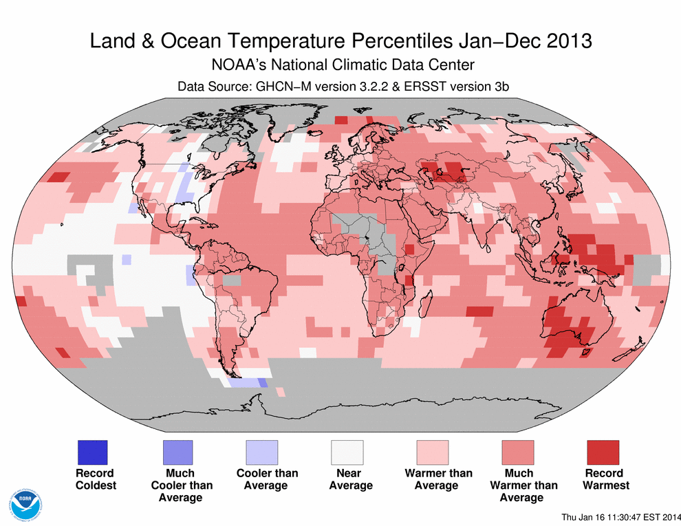 Here is a NOAA National Climatic Data Center map showing land and ocean temperature percentiles from January to December 2013. Personally, I wonder how factually realistic it is, especially what’s shown for the eastern Pacific Ocean, where the legend indicates a “new average.”