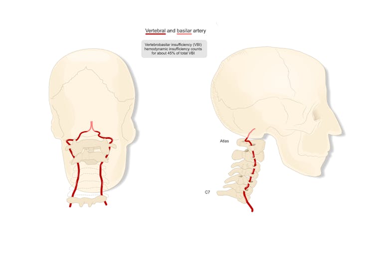 The two vertebral arteries (major arteries of the neck) join up to form the basilar artery that supplies the back of the brain with blood. They are vulnerable to injury by rotation and bending of the neck, as they pass through bony canals in the side arms of the vertebrae and are stretched when the neck is turned.
