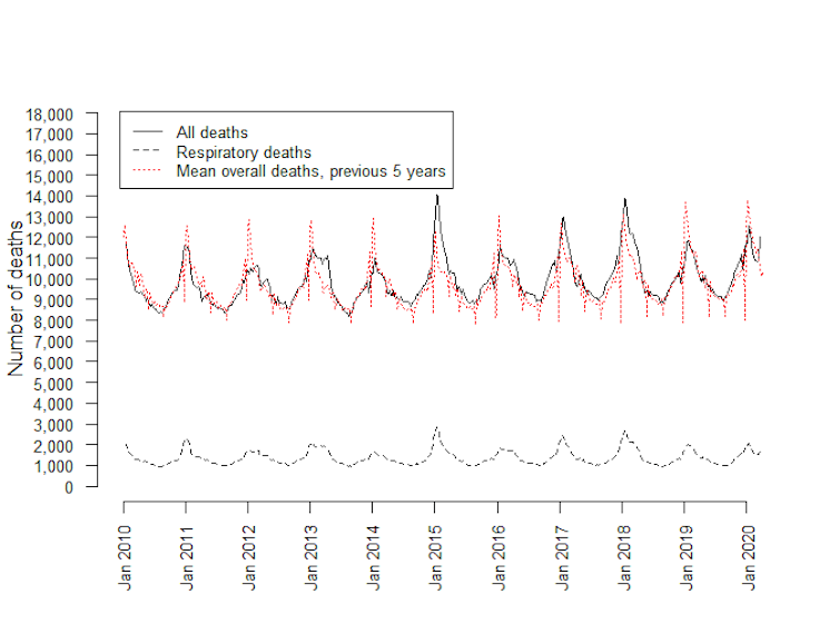At the end of March 2020, the pattern of deaths was normal, but in early April the number of respiratory disease deaths (including COVID-19) climbed above the number expected based on historical rates.
