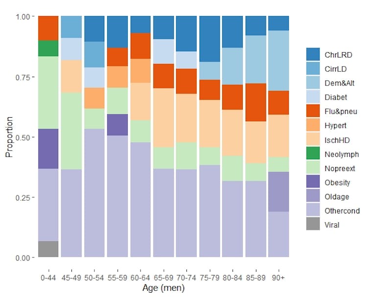 Most deaths (84%) occur in people over 65 years of age and two-thirds (68%) in people over 75 years. When it comes to gender, men die earlier and have a shorter life expectancy at birth (79 years) than women (83 years). The tricky area is understanding the underlying reasons some people die or become more severely ill from COVID-19. To understand what makes certain people more susceptible to this disease, we need to examine the other things that make us ill in the short and long term.